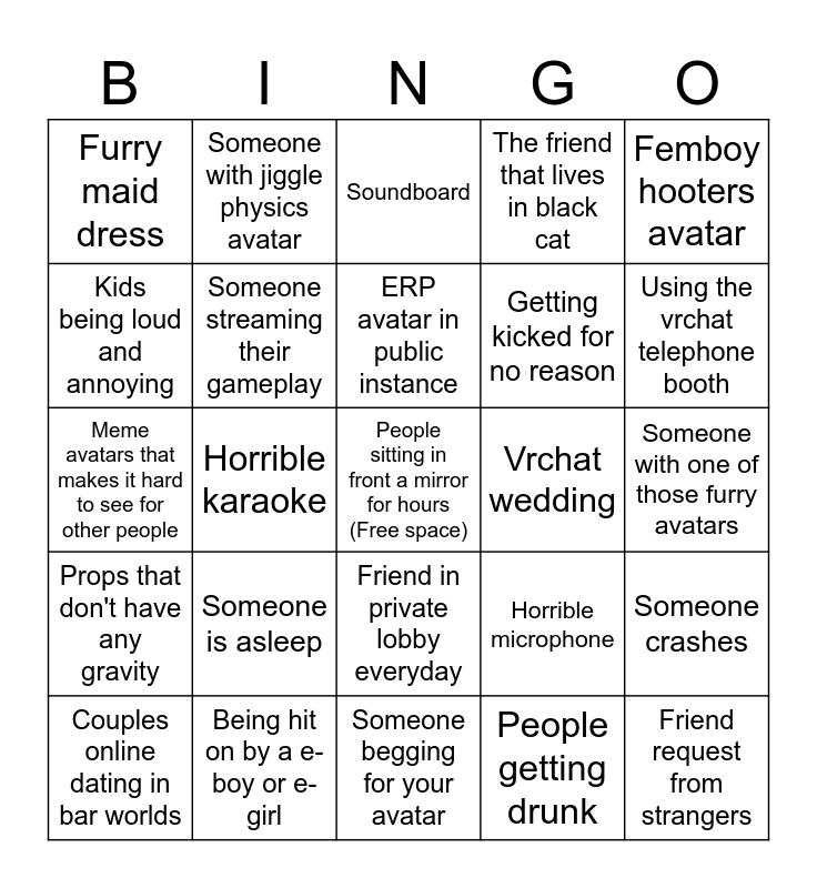 This bingo card has a free space and 24 words: Someone is asleep, Being hit on by a e-boy or e-girl, ERP avatar in public instance, Couples online dating in bar worlds, Femboy hooters avatar, Furry maid dress, Kids being loud and annoying, Someone with jiggle physics avatar, Vrchat wedding, Friend in private lobby everyday, Getting kicked for no reason, Meme avatars that makes it hard to see for other people, Horrible microphone, Someone crashes, Someone streaming their gameplay, People getting drunk, Someone with one of those furry avatars, Soundboard, Using the vrchat telephone booth, Horrible karaoke, Friend request from strangers, Props that don't have any gravity, The friend that lives in black cat and Someone begging for your avatar.