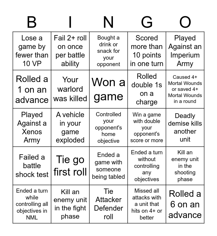 This bingo card has 35 words: Made a 9" or longer charge, Failed a 6" or shorter charge, Killed the enemy warlord, Your warlord was killed, Ended a game with someone being tabled, Scored more than 10 points in one turn, Rolled a 1 on an advance, Rerolled a fail into a fail, Won a game, Lost a game, Played Against a Xenos Army, Played Against an Imperium Army, Your opponent complains about how much they hate challenger cards, Played Against a Chaos Army, Lose a game by fewer than 10 VP, Win a game with double your opponent's score or more, Missed all attacks with a unit that hits on 4+ or better, A vehicle in your game exploded, Failed a battle shock test, Controlled your opponent's home objective, Ended a turn without controlling any objectives, Ended a turn while controlling all objectives in NML, Kill an enemy unit in the shooting phase, Kill an enemy unit in the fight phase, Bought a drink or snack for your opponent, Caused 4+ Mortal Wounds or saved 4+ Mortal Wounds in a round, Rolled a 6 on an advance, Rolled double 6s on a charge, Rolled double 1s on a charge, Deadly demise kills another unit, Fail hit roll with one shot weapon, Tie Attacker Defender roll, Tie go first roll, Fail 2+ roll on once per battle ability and Win or lose 20-0.