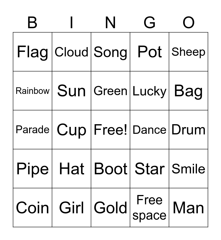 This bingo card has a free space and 25 words: Hat, Gold, Green, Coin, Sheep, Flag, Rainbow, Cloud, Dance, Boot, Lucky, Parade, Star, Smile, Sun, Leaf, Drum, Song, Bag, Cup, Man, Girl, Pipe, Pot and Free space.