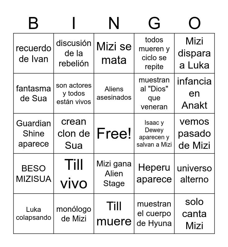 This bingo card has a free space and 24 words: Till vivo, monólogo de Mizi, Aliens asesinados, Luka colapsando, Mizi dispara a Luka, recuerdo de Ivan, fantasma de Sua, discusión de la rebelión, Isaac y Dewey aparecen y salvan a Mizi, Mizi gana Alien Stage, muestran al "Dios" que veneran, Guardian Shine aparece, Heperu aparece, universo alterno, son actores y todos están vivos, muestran el cuerpo de Hyuna, vemos pasado de Mizi, Mizi se mata, infancia en Anakt, crean clon de Sua, solo canta Mizi, BESO MIZISUA, todos mueren y ciclo se repite and Till muere.