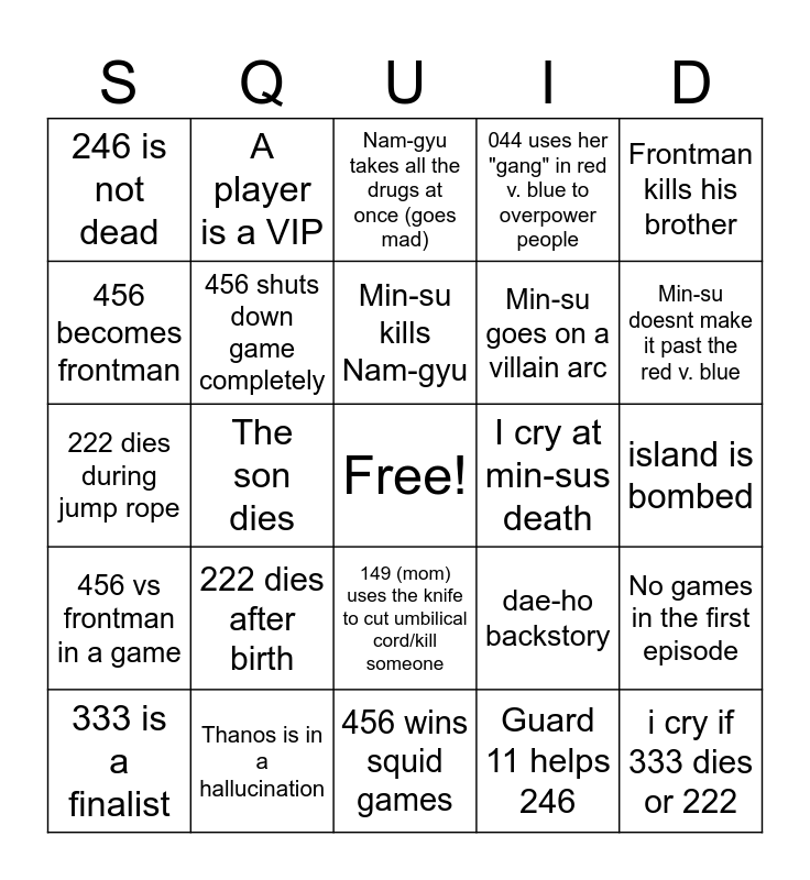 This bingo card has a free space and 24 words: 222 dies after birth, Thanos is in a hallucination, Min-su kills Nam-gyu, 333 is a finalist, Frontman kills his brother, 246 is not dead, 456 becomes frontman, A player is a VIP, I cry at min-sus death, 149 (mom) uses the knife to cut umbilical cord/kill someone, Min-su goes on a villain arc, 222 dies during jump rope, dae-ho backstory, No games in the first episode, 456 shuts down game completely, Guard 11 helps 246, island is bombed, Nam-gyu takes all the drugs at once (goes mad), Min-su doesnt make it past the red v. blue, The son dies, i cry if 333 dies or 222, 456 vs frontman in a game, 044 uses her "gang" in red v. blue to overpower people and 456 wins squid games.