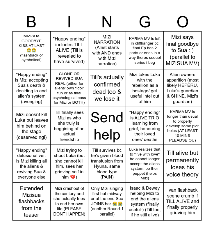 This bingo card has a free space and 24 words: Mizi trying to shoot Luka (but she cannot kill him, sees her grieving self in him 💔), Mizi crashout of the century and she actually tries to end her own life (PLEASE DONT HAPPEN), Till's actually confirmed dead too & we lose it, Extended Mizisua flashbacks from the teaser, Mizi says final goodbye to Sua :,) (parallel to MIZISUA MV), MIZISUA GOODBYE KISS AT LAST ðŸ˜ðŸ˜ (flashback or symbolical), "Happy ending" is Mizi accepting Sua's death & deciding to end alien's system (avenging), "Happy ending" includes TILL ALIVE (Till is revealed to have survived), "Happy ending" is ALIVE TRIO learning from grief, honouring their loved ones' deaths, Till survives bc he's given blood transfusion from Hyuna, same blood type (PAIN), Mizi takes Luka with the rebellion as a hostage/ get useful intel out of him, Mizi doesnt kill Luka but leaves him behind on the stage (deserved ngl), Luka realizes that to "live with love" he cannot longer accept the aliens system, be their puppet (helps Mizi), Till alive but permanently loses his voice theory, CLONE OR REVIVED SUA REAL (either for aliens' own "idol" fun or as final psychological boss for Mizi or BOTH), Isaac & Dewey helping Mizi to end the aliens system (finally useful-) (Till too, if he still alive), KARMA MV is longer than usual to properly develop some plot holes (AT LEAST 10 MINS PLEADSE OU), MIZI NARRATION (Alnst starts with AND ends with Mizi narration), Alien owners apparition (most likely HEPERU, Luka's guardian & SHINE, Mizi's guardian), Till finally sees Mizi as who she truly is, beggining of an actual friendship, Ivan flashback scene crumb if TILL ALIVE and finally properly grieving him, "Happy ending" delusional ver. is Mizi killing all the aliens & reviving Sua & everyone else, KARMA MV is left in cliffhanger bc final Ep has 2 parts or ends in a way theres sequel series i beg and Only Mizi singing first but midway or at the end Sua JOINS her ðŸ˜ðŸ˜ (another Round 1 parallel).