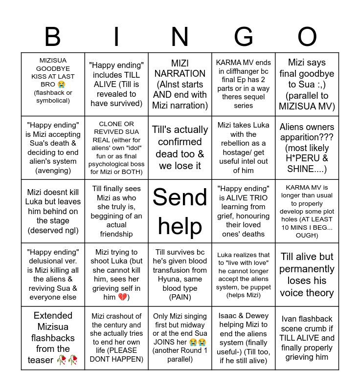 This bingo card has a free space and 24 words: Mizi trying to shoot Luka (but she cannot kill him, sees her grieving self in him 💔), Mizi crashout of the century and she actually tries to end her own life (PLEASE DONT HAPPEN), Till's actually confirmed dead too & we lose it, Extended Mizisua flashbacks from the teaser 🥀🥀, Mizi says final goodbye to Sua :,) (parallel to MIZISUA MV), MIZISUA GOODBYE KISS AT LAST BRO 😠(flashback or symbolical), "Happy ending" is Mizi accepting Sua's death & deciding to end alien's system (avenging), "Happy ending" includes TILL ALIVE (Till is revealed to have survived), "Happy ending" is ALIVE TRIO learning from grief, honouring their loved ones' deaths, Till survives bc he's given blood transfusion from Hyuna, same blood type (PAIN), Mizi takes Luka with the rebellion as a hostage/ get useful intel out of him, Mizi doesnt kill Luka but leaves him behind on the stage (deserved ngl), Luka realizes that to "live with love" he cannot longer accept the aliens system, be puppet (helps Mizi), Till alive but permanently loses his voice theory, CLONE OR REVIVED SUA REAL (either for aliens' own "idol" fun or as final psychological boss for Mizi or BOTH), Isaac & Dewey helping Mizi to end the aliens system (finally useful-) (Till too, if he still alive), KARMA MV is longer than usual to properly develop some plot holes (AT LEAST 10 MINS I BEG... OUGH), MIZI NARRATION (Alnst starts AND end with Mizi narration), Aliens owners apparition???(most likely H*PERU & SHINE....), Till finally sees Mizi as who she truly is, beggining of an actual friendship, Ivan flashback scene crumb if TILL ALIVE and finally properly grieving him, "Happy ending" delusional ver. is Mizi killing all the aliens & reviving Sua & everyone else, KARMA MV ends in cliffhanger bc final Ep has 2 parts or in a way theres sequel series and Only Mizi singing first but midway or at the end Sua JOINS her ðŸ˜ðŸ˜ (another Round 1 parallel).