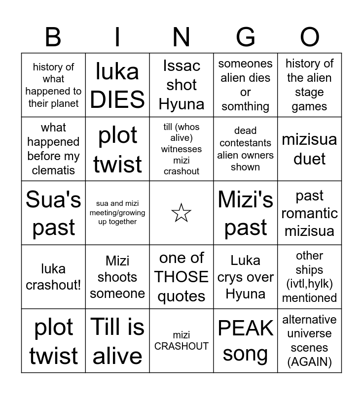 This bingo card has a free space and 24 words: Mizi shoots someone, Till is alive, till (whos alive) witnesses mizi crashout, plot twist, history of the alien stage games, history of what happened to their planet, what happened before my clematis, luka DIES, Mizi's past, one of THOSE quotes, dead contestants alien owners shown, Sua's past, Luka crys over Hyuna, other ships (ivtl,hylk) mentioned, plot twist, PEAK song, past romantic mizisua, Issac shot Hyuna, mizisua duet, sua and mizi meeting/growing up together, alternative universe scenes (AGAIN), luka crashout!, someones alien dies or somthing and mizi CRASHOUT.