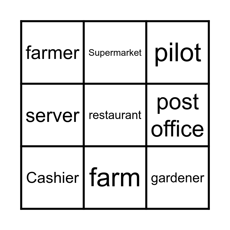 This bingo card has 14 words: Mechanic, Auto repair shop, Cashier, Supermarket, server, restaurant, gardener, garden, farm, farmer, mailman, post office, pilot and airport.