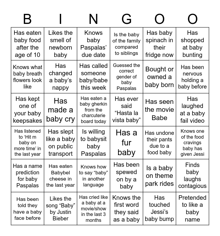 This bingo card has 36 words: Has been spewed on by a baby, Knows how to say “baby” in another language, Knows the first word they said as a baby, Knows what baby breath flowers look like, Has listened to ‘Hit m baby on more time’ in the last year, Has ever said “Hasta la vista baby”, Has changed a baby’s nappy, Has cried like a baby at a movie/show in the last 3 months, Has baby spinach in their fridge now, Is a baby on theme park rides, Has been nervous holding a baby before, Is the baby of the family compared to siblings, Finds baby laughs contagious, Has made a baby cry, Guessed the correct gender of baby Paspalas, Has eaten baby food after the age of 10, Has a name prediction for baby Paspalas, Has seen the movie Babe, Has kept one of your baby keepsakes, Knows baby Paspalas’ due date, Has eaten a baby gherkin from the charcuterie board today, Has slept like a baby on public transport, Has a fur baby, Is willing to babysit baby Paspalas, Has undone their pants due to a food baby, Likes the smell of newborn baby, Bought or owned a baby born, Likes the song “Baby” by Justin Bieber, Has called someone baby/babe this week, Has shopped at baby bunting, Pretended to like a baby name, Has been told they have a baby face before, Knows one of the food cravings baby has given Jessi, Has laughed at a baby fail video, Has eaten Babybel cheese in the last year and Has touched Jessi’s baby bump.