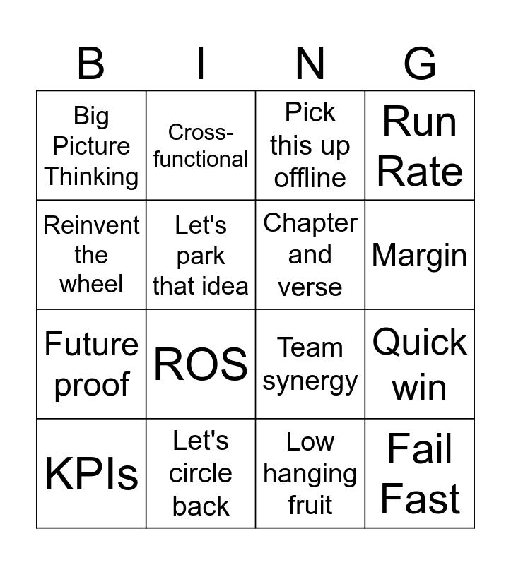 This bingo card has 16 words: Let's circle back, Quick win, Pick this up offline, Big Picture Thinking, Future proof, Cross-functional, Team synergy, Low hanging fruit, Reinvent the wheel, Let's park that idea, KPIs, Run Rate, ROS, Margin, Chapter and verse and Fail Fast.