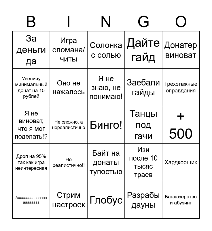 This bingo card has a free space and 24 words: Ааааааааааааааа аааааааа, Не реалистично!!, Я не знаю, не понимаю!, Разрабы дауны, Донатер виноват, За деньги да, Игра сломана/читы, Солонка с солью, Танцы под гачи, + 500, Я не виноват, что я мог поделать!?, Оно не нажалось, Изи после 10 тысяс траев, Хардкорщик, Увеличу минимальный донат на 15 рублей, Стрим настроек, Глобус, Дайте гайд, Трехэтажные оправдания, Дроп на 95% так как игра неинтересная, Не сложно, а нереалистично, Байт на донаты тупостью, Заебали гайды and Багаюзератво и абузинг.