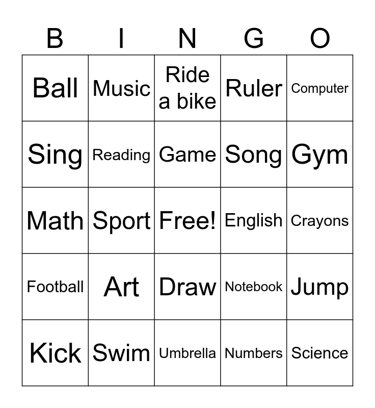 This bingo card has a free space and 24 words: Art, Swim, Game, Kick, Computer, Ball, Sing, Music, English, Draw, Song, Math, Notebook, Jump, Reading, Numbers, Crayons, Ride a bike, Gym, Sport, Science, Football, Ruler and Umbrella.