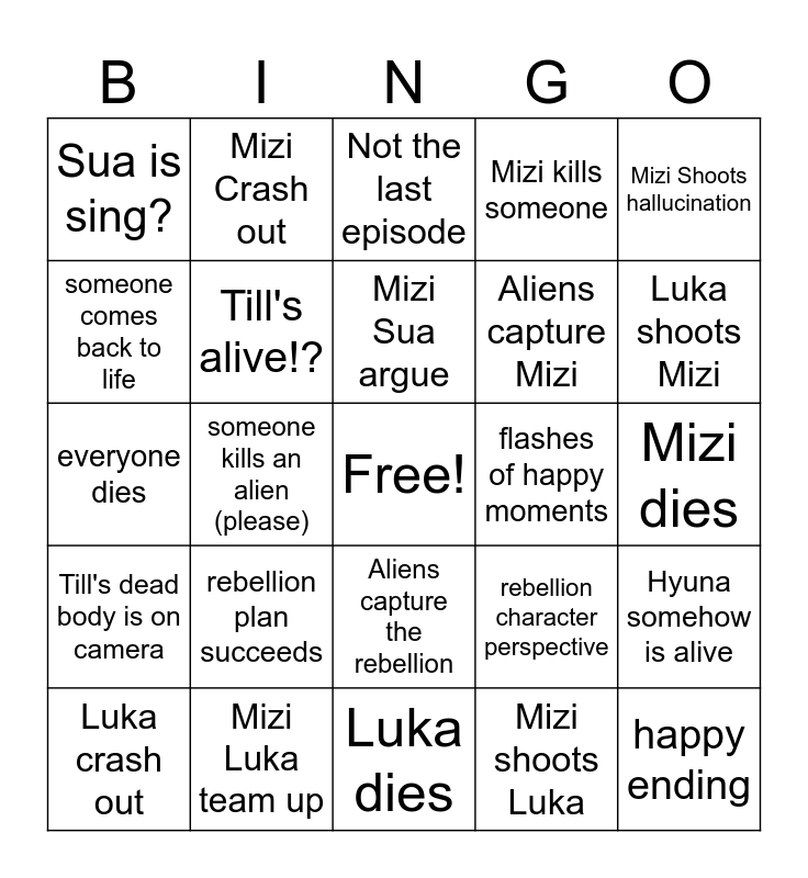 This bingo card has a free space and 24 words: Luka crash out, rebellion plan succeeds, Mizi Sua argue, Mizi shoots Luka, Mizi Shoots hallucination, Sua is sing?, Mizi Crash out, Not the last episode, flashes of happy moments, Mizi dies, everyone dies, Till's alive!?, rebellion character perspective, Hyuna somehow is alive, someone comes back to life, Mizi Luka team up, Luka dies, Mizi kills someone, Luka shoots Mizi, Till's dead body is on camera, someone kills an alien (please), Aliens capture the rebellion, Aliens capture Mizi and happy ending.