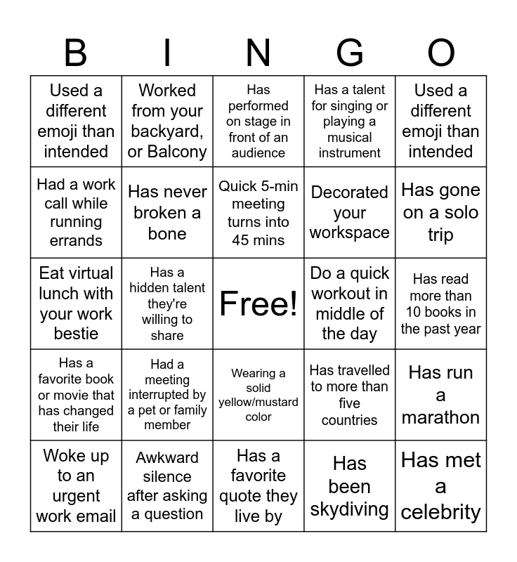 This bingo card has a free space and 24 words: Had a meeting interrupted by a pet or family member, Awkward silence after asking a question, Quick 5-min meeting turns into 45 mins, Woke up to an urgent work email, Used a different emoji than intended, Used a different emoji than intended, Had a work call while running errands, Worked from your backyard, or Balcony, Do a quick workout in middle of the day, Wearing a solid yellow/mustard color, Decorated your workspace, Eat virtual lunch with your work bestie, Has travelled to more than five countries, Has run a marathon, Has never broken a bone, Has been skydiving, Has read more than 10 books in the past year, Has performed on stage in front of an audience, Has gone on a solo trip, Has a hidden talent they're willing to share, Has met a celebrity, Has a favorite book or movie that has changed their life, Has a talent for singing or playing a musical instrument and Has a favorite quote they live by.