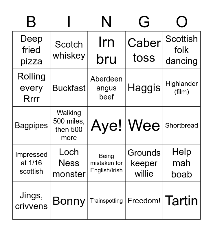 This bingo card has a free space and 24 words: Loch Ness monster, Bonny, Aberdeen angus beef, Jings, crivvens, Scottish folk dancing, Deep fried pizza, Rolling every Rrrr, Scotch whiskey, Wee, Being mistaken for English/Irish, Haggis, Bagpipes, Grounds keeper willie, Help mah boab, Buckfast, Freedom!, Shortbread, Irn bru, Highlander (film), Walking 500 miles, then 500 more, Tartin, Impressed at 1/16 scottish, Caber toss and Trainspotting.