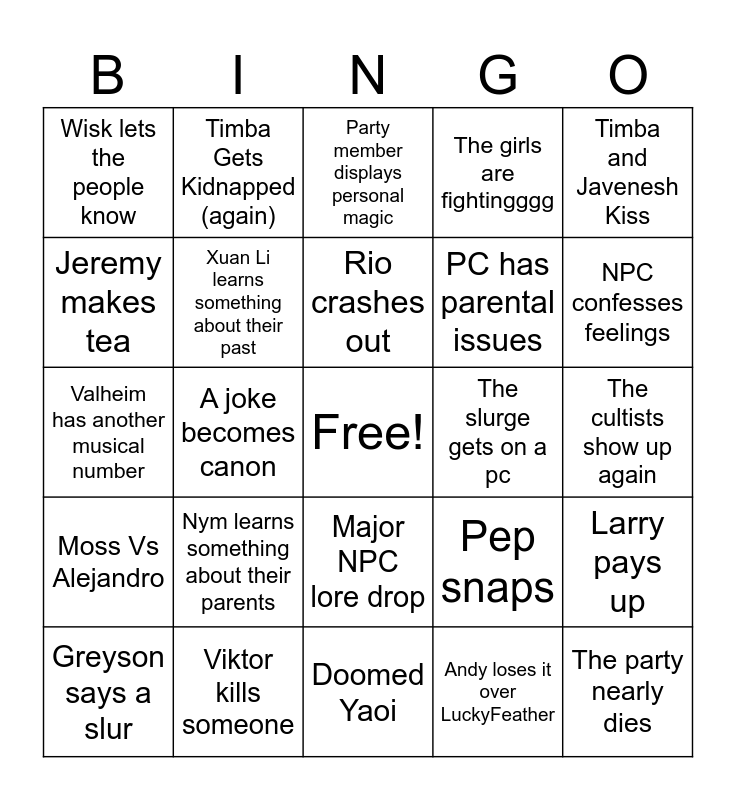 This bingo card has a free space and 24 words: Nym learns something about their parents, Viktor kills someone, Rio crashes out, Greyson says a slur, Timba and Javenesh Kiss, Wisk lets the people know, Jeremy makes tea, Timba Gets Kidnapped (again), The slurge gets on a pc, Major NPC lore drop, PC has parental issues, Valheim has another musical number, Pep snaps, Larry pays up, Xuan Li learns something about their past, Andy loses it over LuckyFeather, The cultists show up again, Party member displays personal magic, NPC confesses feelings, A joke becomes canon, The party nearly dies, Moss Vs Alejandro, The girls are fightingggg and Doomed Yaoi.