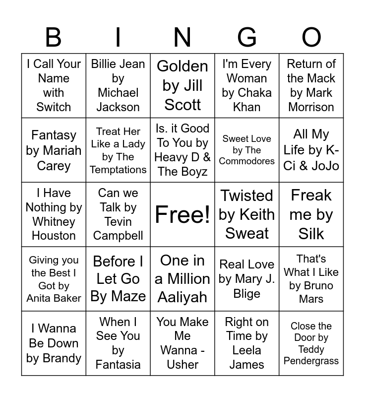 This bingo card has a free space and 39 words: Rock Me Tonight By Freddie Jackson, If by Janet Jackson, Never Too Much Luther Vandross, Treat Her Like a Lady by The Temptations, I Wanna Be Down by Brandy, One in a Million Aaliyah, Is. it Good To You by Heavy D & The Boyz, Holding On by L.T.D., Return of the Mack by Mark Morrison, Giving you the Best I Got by Anita Baker, Can we Talk by Tevin Campbell, I'm Every Woman by Chaka Khan, Close the Door by Teddy Pendergrass, Freak me by Silk, Twisted by Keith Sweat, Before I Let Go By Maze, Whip Appeal by Baby Face, I Call Your Name with Switch, Ascension by Maxwell, Real Love by Mary J. Blige, Fantasy by Mariah Carey, You Make Me Wanna - Usher, Sweet Love by The Commodores, All My Life by K-Ci & JoJo, How Many Ways By Toni Braxton, It's Gonna Rain by Kelly Price, Piece of My Love by Guy, You Know How Love Me by Phyllis Hyman, Isn't She Lovely by Stevie Wonder, Billie Jean by Michael Jackson, Work by Rihanna, Alright by Ledisi, Golden by Jill Scott, When I See You by Fantasia, Right on Time by Leela James, Love on Top by Beyonce, That's What I Like by Bruno Mars, I Have Nothing by Whitney Houston and Giving Him Something He Can Feel by En Vogue.