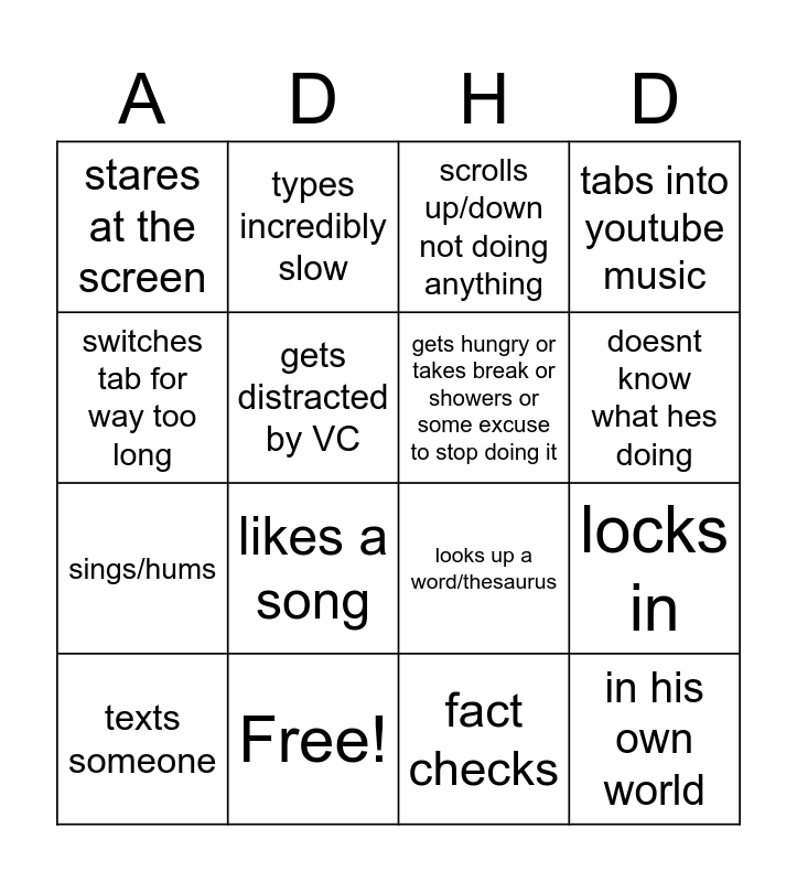 This bingo card has 16 words: Free!, locks in, scrolls up/down not doing anything, stares at the screen, sings/hums, types incredibly slow, looks up a word/thesaurus, fact checks, switches tab for way too long, gets distracted by VC, texts someone, tabs into youtube music, likes a song, doesnt know what hes doing, gets hungry or takes break or showers or some excuse to stop doing it and in his own world.