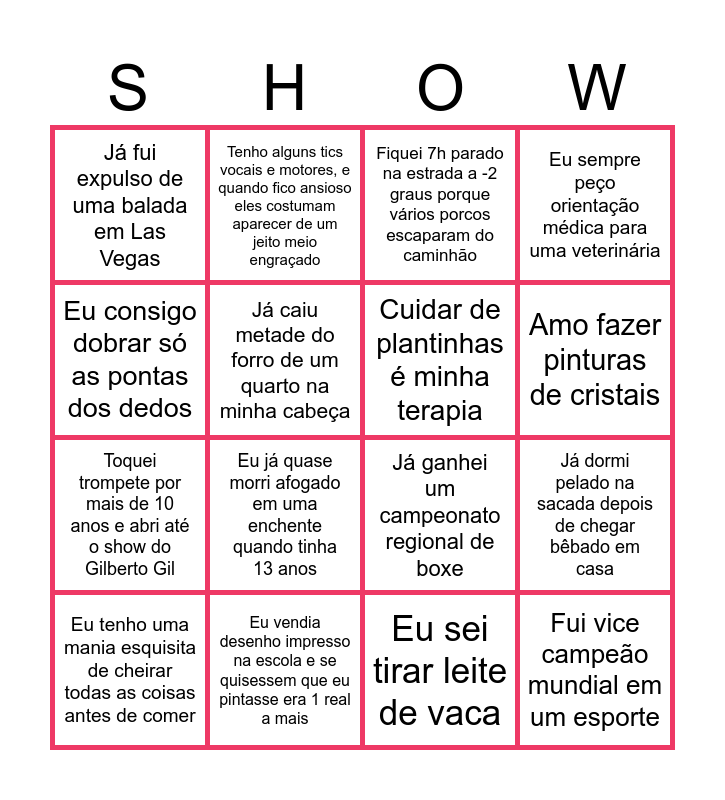 This bingo card has 1 images and 37 words: A cidade que eu moro é conhecida como a cidade do cacau, A minha primeira ida ao motel foi com a minha mãe, Amo fazer pinturas de cristais, Apertei a mão do Michael B Jordan em um evento, Assisti um jogo de copa do mundo do Brasil no país adversário com 100 mil torcedores contra, Cuidar de plantinhas é minha terapia, Eu comi cerol (vidro moído) quando tinha 11 anos, Eu consigo dobrar só as pontas dos dedos, Eu já quase morri afogado em uma enchente quando tinha 13 anos, Eu sei tirar leite de vaca, Eu sempre peço orientação médica para uma veterinária, Eu tenho uma mania esquisita de cheirar todas as coisas antes de comer, Eu vendia desenho impresso na escola e se quisessem que eu pintasse era 1 real a mais, Fiquei 7h parado na estrada a -2 graus porque vários porcos escaparam do caminhão, Fui vice campeão mundial em um esporte, Já atravessei a fronteira dos EUA de ônibus, Já caiu metade do forro de um quarto na minha cabeça, Já dei aula de capoeira infantil, Já dormi pelado na sacada depois de chegar bêbado em casa, Já fui expulso de uma balada em Las Vegas, Já fui modelo quando era criança (fiz alguns trabalhos para colégio, Volvo, shoppings, etc), Já ganhei um campeonato regional de boxe, Já me apresentei na escola com meus amigos, fui o vocalista do grupo de pagode que formamos, Já morei na praia por um ano, em Florianópolis, Já perdi um voo que seria 00:30, pois fui pro aeroporto só no dia seguinte, Já quebrei o pé correndo para pegar o ônibus, Já tirei foto numa festa como se fosse a Clarice Falcão, Lancei um curso digital e tive 25 alunos, Nunca quebrei um osso do corpo, Passei a mão na barriga do Dan Reynolds (vocalista do Imagine Dragons), Sou mecânico nas horas vagas, Sou um grande fã de escolas de samba e defendo enredos com unhas e dentes, Tenho alguns tics vocais e motores, e quando fico ansioso eles costumam aparecer de um jeito meio engraçado, Tenho CNH e não sei dirigir, Uso três despertadores diferentes porque não confio em mim mesmo de manhã, Toquei trompete por mais de 10 anos e abri até o show do Gilberto Gil and Fico horas vendo vídeos de restauração de coisas antigas — é hipnotizante.