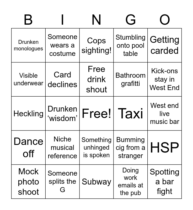 This bingo card has a free space and 24 words: Mock photo shoot, Niche musical reference, Free drink shout, Doing work emails at the pub, Getting carded, Drunken monologues, Someone wears a costume, Cops sighting!, Taxi, West end live music bar, Heckling, Card declines, Bumming cig from a stranger, HSP, Visible underwear, Someone splits the G, Subway, Stumbling onto pool table, Kick-ons stay in West End, Dance off, Drunken ‘wisdom’, Something unhinged is spoken, Bathroom grafitti and Spotting a bar fight.