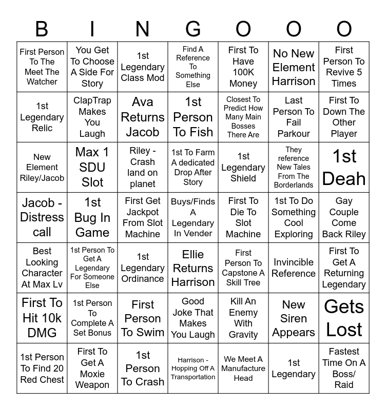 This bingo card has 56 words: 1st Legendary, 1st Deah, Lilith Dies, First Person To The Meet The Watcher, 1st Bug In Game, First Person To Swim, First Person To Revive 5 Times, First One To Look down Moxis Titts, ClapTrap Makes You Laugh, Good Joke That Makes You Laugh, Find A Reference To Something Else, First To Hit 10k DMG, Best Looking Character At Max Lv, Gay Couple Come Back Riley, First To Get A Moxie Weapon, 1st Person To Get A Legendary For Someone Else, First To Have 100K Money, Closest To Predict How Many Main Bosses There Are, Fastest Time On A Boss/ Raid, Last Person To Fail Parkour, First To Down The Other Player, 1st Legendary Ordinance, 1st Legendary Shield, 1st Legendary Class Mod, 1st Legendary Weapon, 1st Legendary Relic, 1st To Do Something Cool Exploring, Main NPC Death, Ava Returns Jacob, Ellie Returns Harrison, Blows Self Up On Accident, First To Get A Returning Legendary, 1st Person To Find 20 Red Chest, 1st Person To Crash, New Element Riley/Jacob, No New Element Harrison, 1st Person To Fish, 1st Person To Complete A Set Bonus, Max 1 SDU Slot, You Get To Choose A Side For Story, 1st To Farm A dedicated Drop After Story, Buys/Finds A Legendary In Vender, Kill An Enemy With Gravity, Say/ There IS (Welcome To Sanctuary), Gets Lost, Riley - Crash land on planet, Jacob - Distress call, Harrison - Hopping Off A Transportation, Invincible Reference, First To Die To Slot Machine, First Get Jackpot From Slot Machine, First Person To Capstone A Skill Tree, New Siren Appears, We Meet A Manufacture Head, They reference New Tales From The Borderlands and Hidden Objective Completed.