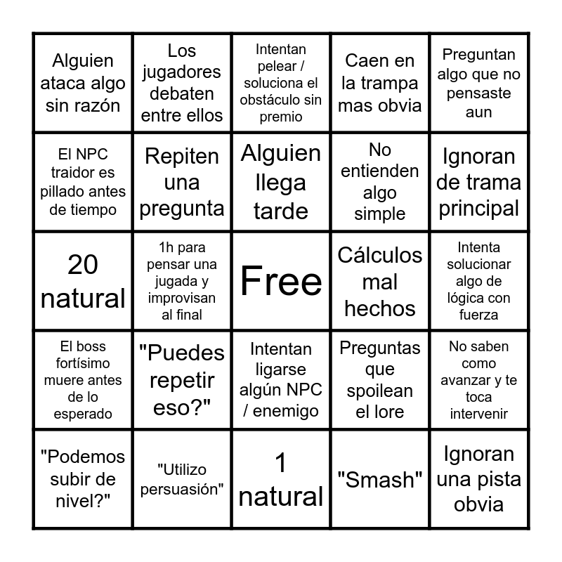 This bingo card has a free space and 24 words: "Puedes repetir eso?", "Utilizo persuasión", Alguien llega tarde, "Podemos subir de nivel?", Preguntan algo que no pensaste aun, Alguien ataca algo sin razón, El NPC traidor es pillado antes de tiempo, Los jugadores debaten entre ellos, Cálculos mal hechos, Intentan ligarse algún NPC / enemigo, No entienden algo simple, 20 natural, Preguntas que spoilean el lore, No saben como avanzar y te toca intervenir, Repiten una pregunta, "Smash", Intenta solucionar algo de lógica con fuerza, Intentan pelear / soluciona el obstáculo sin premio, Ignoran de trama principal, 1h para pensar una jugada y improvisan al final, Ignoran una pista obvia, El boss fortísimo muere antes de lo esperado, Caen en la trampa mas obvia and 1 natural.