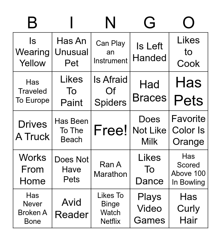 This bingo card has a free space and 24 words: Does Not Have Pets, Avid Reader, Is Afraid Of Spiders, Has Never Broken A Bone, Likes to Cook, Is Wearing Yellow, Has Traveled To Europe, Has An Unusual Pet, Does Not Like Milk, Ran A Marathon, Had Braces, Drives A Truck, Likes To Dance, Has Scored Above 100 In Bowling, Likes To Paint, Plays Video Games, Favorite Color Is Orange, Can Play an Instrument, Has Pets, Has Been To The Beach, Has Curly Hair, Works From Home, Is Left Handed and Likes To Binge Watch Netflix.
