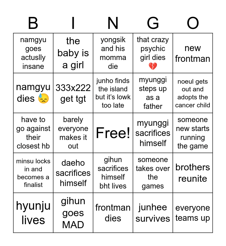 This bingo card has a free space and 24 words: daeho sacrifices himself, gihun goes MAD, junho finds the island but itβs lowk too late, hyunju lives, new frontman, namgyu goes actuslly insane, namgyu dies π, the baby is a girl, myunggi sacrifices himself, gihun sacrifices himself bht lives, myunggi steps up as a father, have to go against their closest hb, someone takes over the games, brothers reunite, 333x222 get tgt, junhee survives, someone new starts running the game, yongsik and his momma die, noeul gets out and adopts the cancer child, barely everyone makes it out, everyone teams up, minsu locks in and becomes a finalist, that crazy psychic girl dies π and frontman dies.