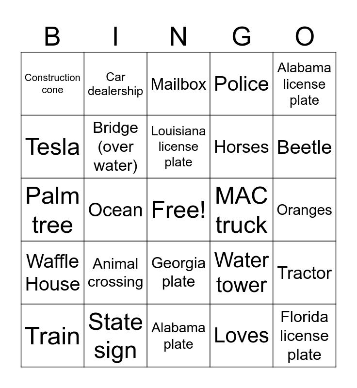 This bingo card has a free space and 58 words: Buccees billboard, State sign, Broken down car, Waffle House, Loves, Body of water, Bridge (over water), Cows, Horses, Windmills, Police, Camper, Amazon truck, Silo, Water tower, Construction cone, Florida license plate, Alabama license plate, Mississippi license plate, Louisiana license plate, MAC truck, Mailbox, Train, Tractor, Jesus sign, Oranges, Casino sign, Wrong way, Beetle, Oversized load, Two way, Tanker truck, Firework stand, College, Injury billboard, Dog in car, American flag, Ocean, Palm tree, Plane, Animal crossing, Road kill, Water tower, Fruit stand, Waffle House, Broken down car, Texas plate, Georgia plate, Alabama plate, Amazon truck, Police, Car twins!!, Boat, Rest stop, Car dealership, Circle K, Tesla and Motorcycle.