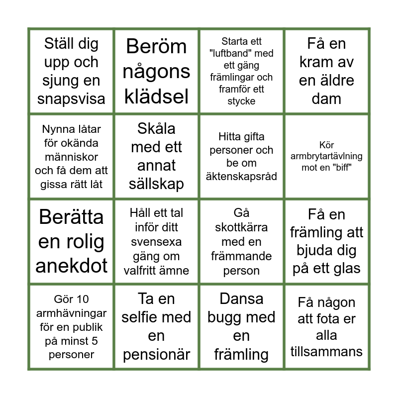 This bingo card has 16 words: Ta en selfie med en pensionär, Få en främling att bjuda dig på ett glas, Starta ett "luftband" med ett gäng främlingar och framför ett stycke, Ställ dig upp och sjung en snapsvisa, Berätta en rolig anekdot, Beröm någons klädsel, Gå skottkärra med en främmande person, Dansa bugg med en främling, Nynna låtar för okända människor och få dem att gissa rätt låt, Skåla med ett annat sällskap, Gör 10 armhävningar för en publik på minst 5 personer, Få en kram av en äldre dam, Håll ett tal inför ditt svensexa gäng om valfritt ämne, Kör armbrytartävlning mot en "biff", Hitta gifta personer och be om äktenskapsråd and Få någon att fota er alla tillsammans.