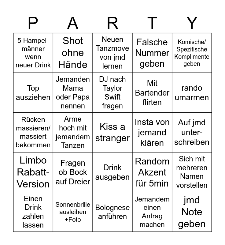 This bingo card has a free space and 24 words: Fragen ob Bock auf Dreier, Sonnenbrille ausleihen +Foto, DJ nach Taylor Swift fragen, Einen Drink zahlen lassen, Komische/ Spezifische Komplimente geben, 5 Hampel-männer wenn neuer Drink, Top ausziehen, Shot ohne Hände, Insta von jemand klären, Drink ausgeben, Mit Bartender flirten, Rücken massieren/ massiert bekommen, Random Akzent für 5min, Sich mit mehreren Namen vorstellen, Jemanden Mama oder Papa nennen, Jemandem einen Antrag machen, Auf jmd unter- schreiben, Neuen Tanzmove von jmd lernen, rando umarmen, Arme hoch mit jemandem Tanzen, jmd Note geben, Limbo Rabatt-Version, Falsche Nummer geben and Bolognese anführen.