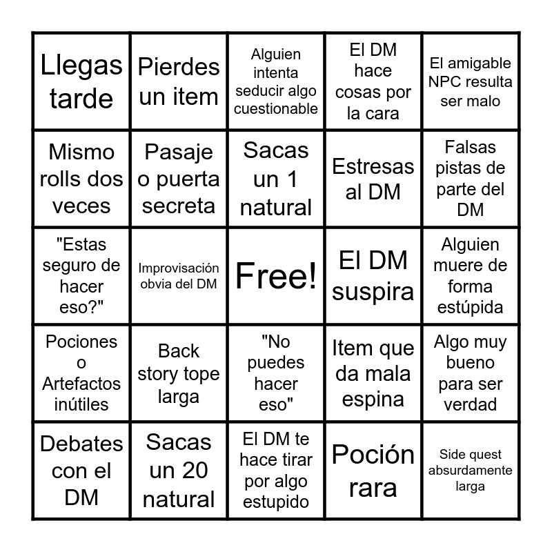 This bingo card has a free space and 24 words: Back story tope larga, Sacas un 20 natural, Sacas un 1 natural, Debates con el DM, El amigable NPC resulta ser malo, Llegas tarde, Mismo rolls dos veces, Pierdes un item, El DM suspira, "No puedes hacer eso", Estresas al DM, "Estas seguro de hacer eso?", Item que da mala espina, Algo muy bueno para ser verdad, Pasaje o puerta secreta, Poción rara, Alguien muere de forma estúpida, Alguien intenta seducir algo cuestionable, Falsas pistas de parte del DM, Improvisación obvia del DM, Side quest absurdamente larga, Pociones o Artefactos inútiles, El DM hace cosas por la cara and El DM te hace tirar por algo estupido.