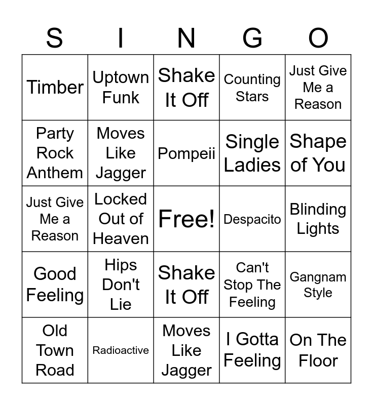 This bingo card has a free space and 61 words: Crazy In Love, Hips Don't Lie, Just Dance, Don't Stop The Music, Blinding Lights, I Gotta Feeling, Moves Like Jagger, DJ Got Us Falling In Love, Despacito, Good Feeling, Party Rock Anthem, Can't Stop The Feeling, Single Ladies, On The Floor, Timber, Uptown Funk, Pompeii, Counting Stars, Call Me Maybe, Just Give Me a Reason, Locked Out of Heaven, Shake It Off, Sorry, Shape of You, Shape of You, Sorry, Shake It Off, Locked Out of Heaven, Just Give Me a Reason, Call Me Maybe, Counting Stars, Pompeii, Despacito, Uptown Funk, Timber, On The Floor, Single Ladies, Can't Stop The Feeling, Party Rock Anthem, Good Feeling, DJ Got Us Falling In Love, Moves Like Jagger, I Gotta Feeling, Blinding Lights, Don't Stop The Music, Just Dance, Hips Don't Lie, Crazy In Love, Hotline Bling, Old Town Road, Radioactive, We Are Young, Chandelier, Gangnam Style, Thunder, Girl on Fire, Firework, What Makes You Beautiful, Gasolina, Viva La Vida and Senorita.