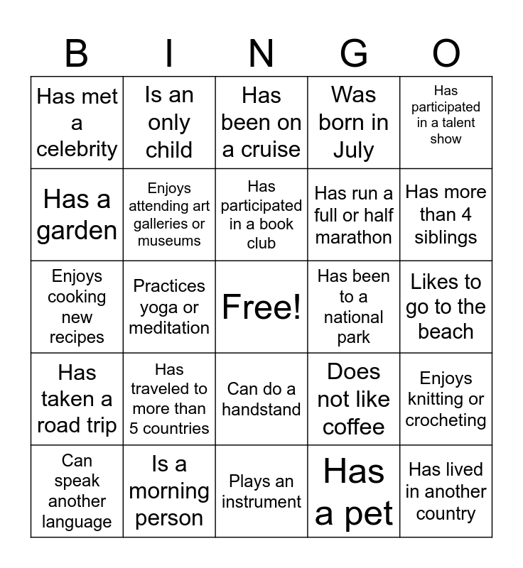 This bingo card has a free space and 24 words: Has traveled to more than 5 countries, Is a morning person, Has participated in a book club, Can speak another language, Has participated in a talent show, Has met a celebrity, Has a garden, Is an only child, Has been to a national park, Can do a handstand, Has run a full or half marathon, Enjoys cooking new recipes, Does not like coffee, Enjoys knitting or crocheting, Enjoys attending art galleries or museums, Has a pet, Likes to go to the beach, Has been on a cruise, Has more than 4 siblings, Practices yoga or meditation, Has lived in another country, Has taken a road trip, Was born in July and Plays an instrument.
