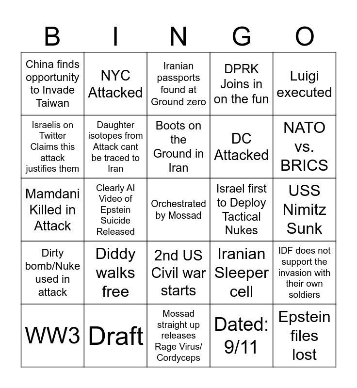 This bingo card has a free space and 24 words: Diddy walks free, Draft, Boots on the Ground in Iran, WW3, Luigi executed, China finds opportunity to Invade Taiwan, Israelis on Twitter Claims this attack justifies them, NYC Attacked, Israel first to Deploy Tactical Nukes, 2nd US Civil war starts, DC Attacked, Mamdani Killed in Attack, Iranian Sleeper cell, IDF does not support the invasion with their own soldiers, Daughter isotopes from Attack cant be traced to Iran, Dated: 9/11, USS Nimitz Sunk, Iranian passports found at Ground zero, NATO vs. BRICS, Clearly AI Video of Epstein Suicide Released, Epstein files lost, Dirty bomb/Nuke used in attack, DPRK Joins in on the fun and Mossad straight up releases Rage Virus/ Cordyceps.
