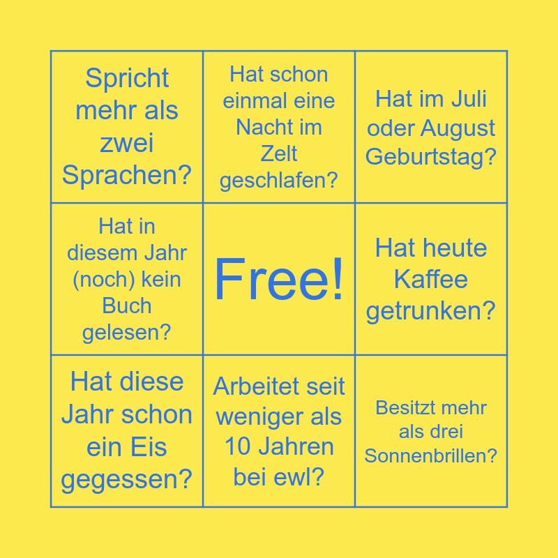This bingo card has a free space and 14 words: War dieses Jahr schon im See oder Meer schwimmen?, Hat schon einmal im Homeoffice im Pyjama gearbeitet?, Hat diese Jahr schon ein Eis gegessen?, Hat schon einmal eine Nacht im Zelt geschlafen?, Hat in diesem Jahr (noch) kein Buch gelesen?, Besitzt mehr als drei Sonnenbrillen?, Hat dieses Jahr schon eine Flugreise gemacht?, War schon auf dem Stanserhorn?, Arbeitet seit weniger als 10 Jahren bei ewl?, Spricht mehr als zwei Sprachen?, Hat schon einmal bei einer Tombola oder beim Lotto etwas gewonnen?, Hat heute Kaffee getrunken?, Hat im Juli oder August Geburtstag? and Hat schon einmal einen Marathon oder Halbmarathon absolviert?.
