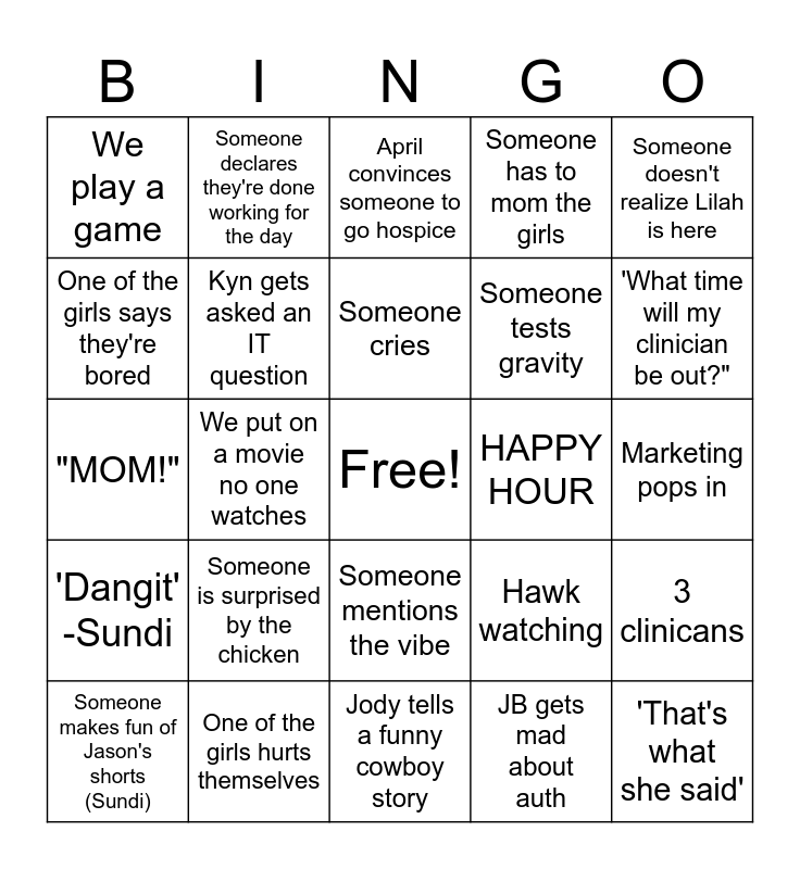 This bingo card has a free space and 24 words: Someone is surprised by the chicken, One of the girls hurts themselves, Someone cries, Someone makes fun of Jason's shorts (Sundi), Someone doesn't realize Lilah is here, We play a game, One of the girls says they're bored, Someone declares they're done working for the day, HAPPY HOUR, Someone mentions the vibe, Someone tests gravity, "MOM!", Hawk watching, 3 clinicans, Kyn gets asked an IT question, JB gets mad about auth, Marketing pops in, April convinces someone to go hospice, 'What time will my clinician be out?", We put on a movie no one watches, 'That's what she said', 'Dangit' -Sundi, Someone has to mom the girls and Jody tells a funny cowboy story.