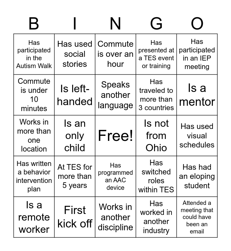 This bingo card has a free space and 24 words: At TES for more than 5 years, First kick off, Speaks another language, Is a remote worker, Has participated in an IEP meeting, Has participated in the Autism Walk, Commute is under 10 minutes, Has used social stories, Is not from Ohio, Has programmed an AAC device, Has traveled to more than 3 countries, Works in more than one location, Has switched roles within TES, Has had an eloping student, Is left-handed, Has worked in another industry, Has used visual schedules, Commute is over an hour, Is a mentor, Is an only child, Attended a meeting that could have been an email, Has written a behavior intervention plan, Has presented at a TES event or training and Works in another discipline.