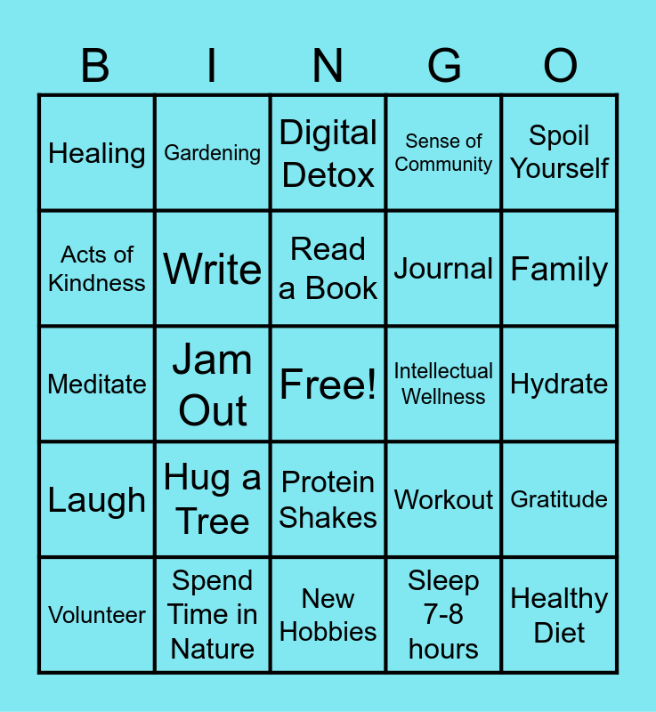 This bingo card has a free space and 36 words: Healthy Habits, Meaningful Life, Social Wellness, Write, Workout, Laugh, Read a Book, Balance, Spoil Yourself, Physical Wellness, Jam Out, Sense of Community, Burnout, Intellectual Wellness, Family, Healing, Deep Breaths, Hug a Tree, Healthy Diet, Digital Detox, Hydrate, Gratitude, Spend Time in Nature, Volunteer, New Hobbies, Gardening, Meditate, Yoga, Journal, Acts of Kindness, Take a Class, Positive Thinking, Sleep 7-8 hours, Protein Shakes, Skip Sweets 1 Day and Walk 10K Steps.