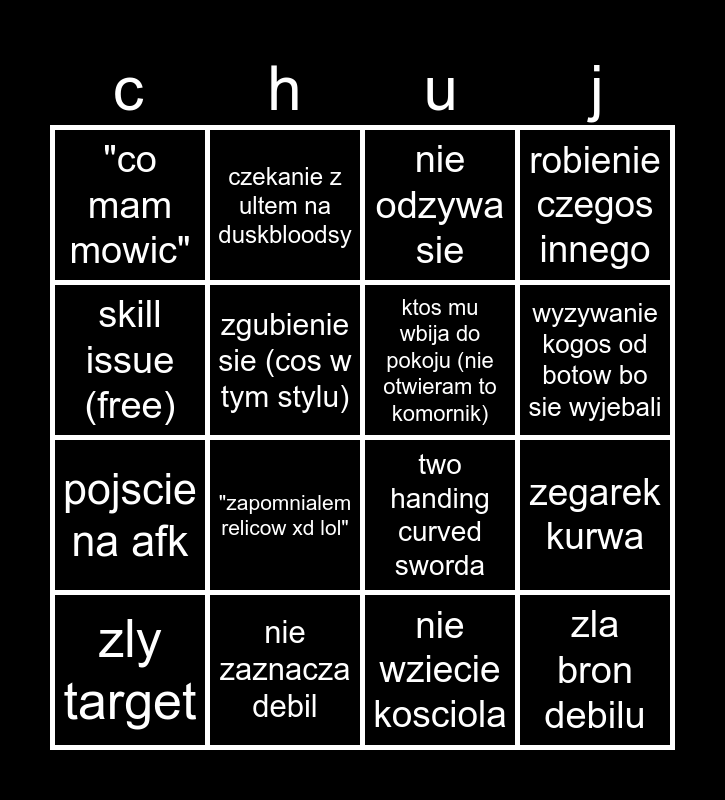 This bingo card has 16 words: nie zaznacza debil, zegarek kurwa, nie odzywa sie, "co mam mowic", pojscie na afk, czekanie z ultem na duskbloodsy, two handing curved sworda, nie wziecie kosciola, skill issue (free), zgubienie sie (cos w tym stylu), zly target, robienie czegos innego, "zapomnialem relicow xd lol", wyzywanie kogos od botow bo sie wyjebali, ktos mu wbija do pokoju (nie otwieram to komornik) and zla bron debilu.