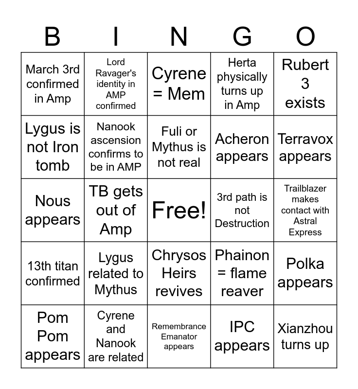 This bingo card has a free space and 24 words: Lygus related to Mythus, Cyrene and Nanook are related, Fuli or Mythus is not real, Pom Pom appears, Rubert 3 exists, March 3rd confirmed in Amp, Lygus is not Iron tomb, Lord Ravager's identity in AMP confirmed, 3rd path is not Destruction, Chrysos Heirs revives, Acheron appears, Nous appears, Phainon = flame reaver, Polka appears, Nanook ascension confirms to be in AMP, IPC appears, Trailblazer makes contact with Astral Express, Cyrene = Mem, Terravox appears, TB gets out of Amp, Xianzhou turns up, 13th titan confirmed, Herta physically turns up in Amp and Remembrance Emanator appears.