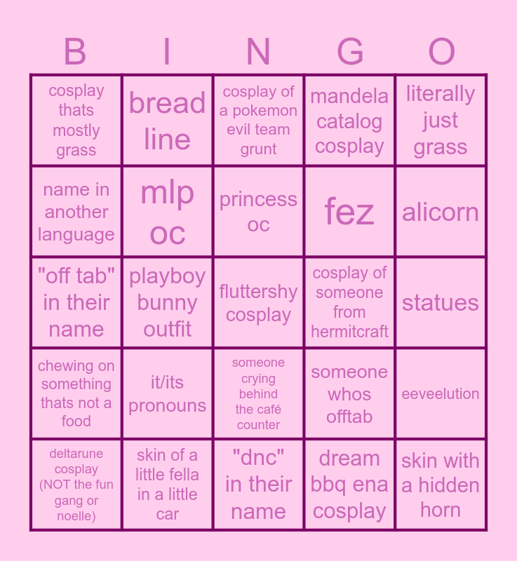 This bingo card has 56 words: Free!, deltarune cosplay (NOT the fun gang or noelle), mafioso forsaken cosplay, cosplay thats mostly grass, "dnc" in their name, "c+h" in their name, mlp oc, king sombra cosplay, fez, eye bleeds, mandela catalog cosplay, cosplay from a dead/niche fandom, emo, scene, hatsune miku, matching skins, literally just grass, playboy bunny outfit, black and white, fluttershy cosplay, cosplay of someone from hermitcraft, meme skin, someone whos offtab, cosplay of a pokemon evil team grunt, pride flag pony, princess oc, custom plushie on someones head, holding a crowbar, alicorn, different color text box, has github linked, has discord linked, holding an axe, holding a saw, statues, name in another language, "off tab" in their name, in the water, chewing on something thats not a food, bread line, someone crying behind the café counter, skin with a hidden horn, single color skin, two ponies booping eachother, neo pronouns, it/its pronouns, skin of a little fella in a little car, "tt" or "td" in their name, dead body skin, transformers cosplay, dream bbq ena cosplay, homestuck cosplay, actual roleplayers, shadow milk and pure vanilla cuddling, eeveelution and dandys world twisted cosplay.