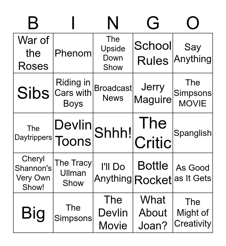 This bingo card has a free space and 24 words: The Tracy Ullman Show, The Simpsons, Broadcast News, Big, Say Anything, War of the Roses, Sibs, Phenom, The Critic, I'll Do Anything, Jerry Maguire, The Daytrippers, Bottle Rocket, As Good as It Gets, Riding in Cars with Boys, What About Joan?, Spanglish, The Upside Down Show, The Simpsons MOVIE, Devlin Toons, The Might of Creativity, Cheryl Shannon's Very Own Show!, School Rules and The Devlin Movie.