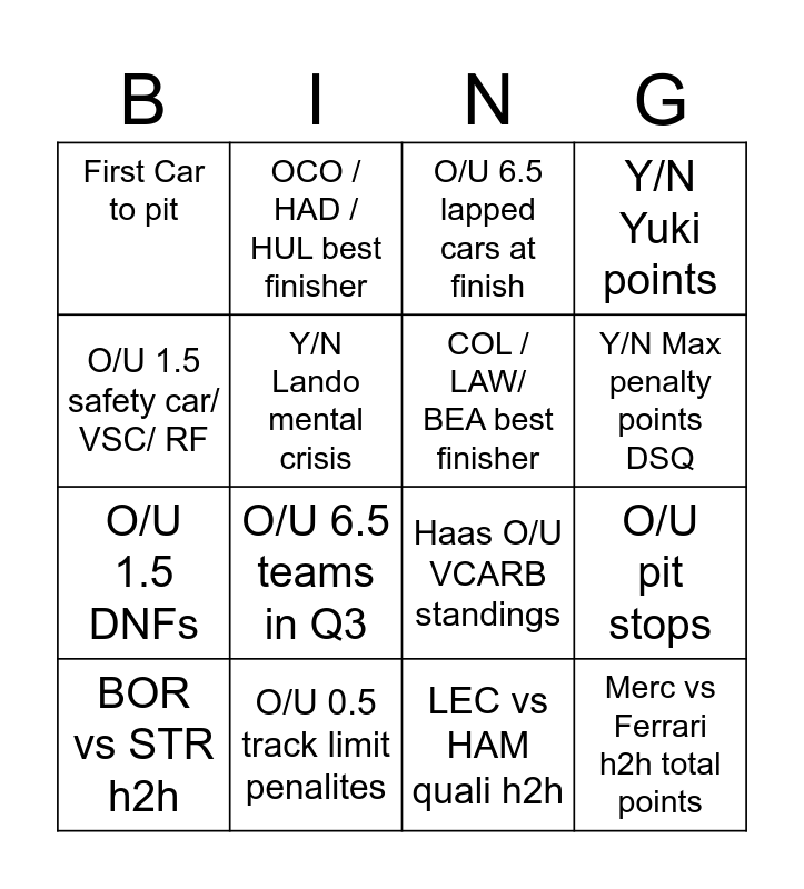 This bingo card has 16 words: O/U 0.5 track limit penalites, O/U pit stops, O/U 6.5 lapped cars at finish, First Car to pit, O/U 1.5 DNFs, OCO / HAD / HUL best finisher, Haas O/U VCARB standings, LEC vs HAM quali h2h, O/U 1.5 safety car/ VSC/ RF, Y/N Lando mental crisis, BOR vs STR h2h, Y/N Yuki points, O/U 6.5 teams in Q3, Y/N Max penalty points DSQ, COL / LAW/ BEA best finisher and Merc vs Ferrari h2h total points.