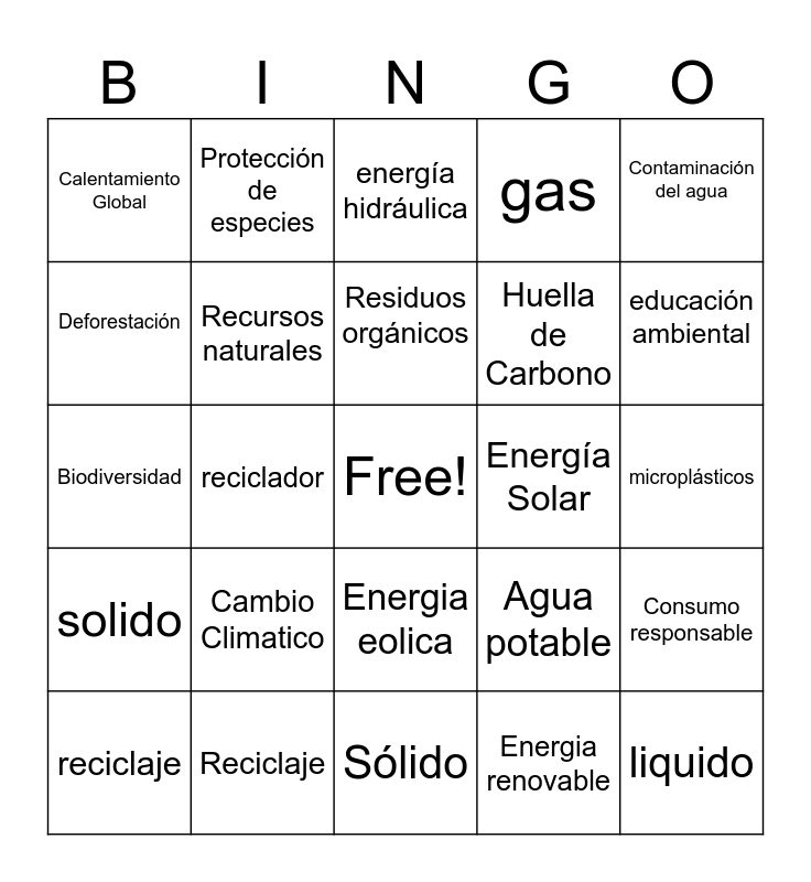This bingo card has a free space and 24 words: Cambio Climatico, Reciclaje, Residuos orgánicos, reciclaje, Contaminación del agua, Calentamiento Global, Deforestación, Protección de especies, Energía Solar, Energia eolica, Huella de Carbono, Biodiversidad, Agua potable, Consumo responsable, Recursos naturales, Energia renovable, microplásticos, energía hidráulica, educación ambiental, reciclador, liquido, solido, gas and Sólido.