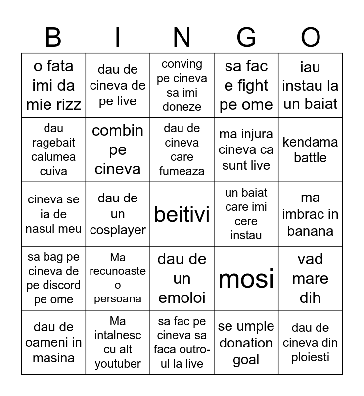 This bingo card has a free space and 24 words: Ma recunoaste o persoana, Ma intalnesc cu alt youtuber, dau de cineva care fumeaza, dau de oameni in masina, iau instau la un baiat, o fata imi da mie rizz, dau ragebait calumea cuiva, dau de cineva de pe live, un baiat care imi cere instau, dau de un emoloi, ma injura cineva ca sunt live, cineva se ia de nasul meu, mosi, vad mare dih, combin pe cineva, se umple donation goal, ma imbrac in banana, conving pe cineva sa imi doneze, kendama battle, dau de un cosplayer, dau de cineva din ploiesti, sa bag pe cineva de pe discord pe ome, sa fac e fight pe ome and sa fac pe cineva sa faca outro-ul la live.