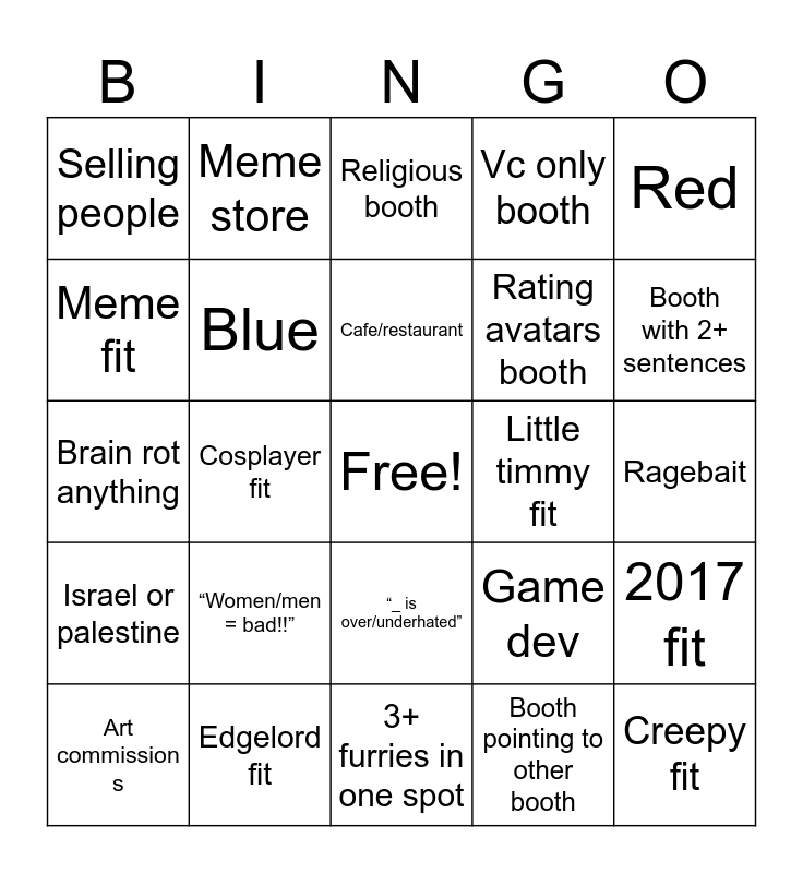 This bingo card has a free space and 33 words: Gooner fit, Furry fit, Cosplayer fit, Controversial booth, Israel or palestine, Blue, Red, Art commission s, Meme store, Actually good store, Cafe/restaurant, Religious booth, Retroslop, Actual retro fit, Little timmy fit, Booth with 2+ sentences, Edgelord fit, Brain rot anything, “Women/men = bad!!”, Game dev, “_ is over/underhated”, “Cancel _”, Selling people, Ragebait, 3+ furries in one spot, Creepy fit, Vc only booth, Rating avatars booth, Meme fit, 2017 fit, Fake limited fit, Booth pointing to other booth and Old man posing as kid.