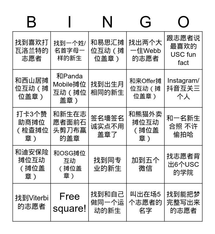 This bingo card has a free space and 24 words: 和OSG摊位互动 (摊位盖章), Free square!, 找到出生月相同的新生, 找到Viterbi 的志愿者, 跟志愿者说 最喜欢的 USC fun fact, 找到喜欢打 瓦洛兰特的志愿者, 和西山居摊 位互动(摊位盖章), 找到一个姓/名首字母一样的新生, 和熊猫外卖摊位互动(摊位盖章), 找到同专业的新生, 和来Offer摊位互动(摊位盖章), 打卡3个赞助商摊位(检查摊位章), 加到五个 微信, 找志愿者背 出6个USC 的学院, 和Panda Mobile摊位 互动(摊位 盖章), 叫出在场5个志愿者的 名字, 和一名新生 合照 不许偷拍哈, 和易思汇摊位互动(摊位盖章), Instagram/ 抖音互关三 个人, 和新生在志愿者面前石头剪刀布赢的盖章, 找到能把梦 完整写出来的志愿者, 和迪安保险摊位互动(摊位盖章), 找出两个大一住Webb的志愿者 and 找到和自己做同一个运动的新生.