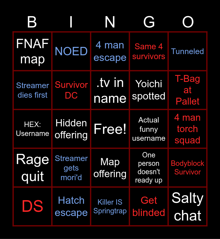 This bingo card has a free space and 24 words: Streamer gets mori'd, Hatch escape, .tv in name, DS, Tunneled, FNAF map, Streamer dies first, NOED, Actual funny username, Map offering, Yoichi spotted, HEX: Username, One person doesn't ready up, Bodyblock Survivor, Survivor DC, Get blinded, 4 man torch squad, 4 man escape, T-Bag at Pallet, Hidden offering, Salty chat, Rage quit, Same 4 survivors and Killer IS Springtrap.