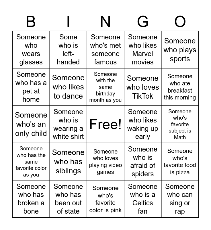 This bingo card has a free space and 24 words: Someone who has siblings, Someone who has been out of state, Someone with the same birthday month as you, Someone who has broken a bone, Someone who plays sports, Someone who wears glasses, Someone who has a pet at home, Some who is left-handed, Someone who likes waking up early, Someone who loves playing video games, Someone who loves TikTok, Someone who's an only child, Someone who is afraid of spiders, Someone who's favorite food is pizza, Someone who likes to dance, Someone who is a Celtics fan, Someone who's favorite subject is Math, Someone who's met someone famous, Someone who ate breakfast this morning, Someone who is wearing a white shirt, Someone who can sing or rap, Someone who has the same favorite color as you, Someone who likes Marvel movies and Someone who's favorite color is pink.