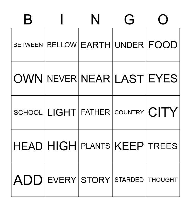 This bingo card has a free space and 24 words: HIGH, EVERY, NEAR, ADD, FOOD, BETWEEN, OWN, BELLOW, COUNTRY, PLANTS, LAST, SCHOOL, KEEP, TREES, NEVER, STARDED, CITY, EARTH, EYES, LIGHT, THOUGHT, HEAD, UNDER and STORY.