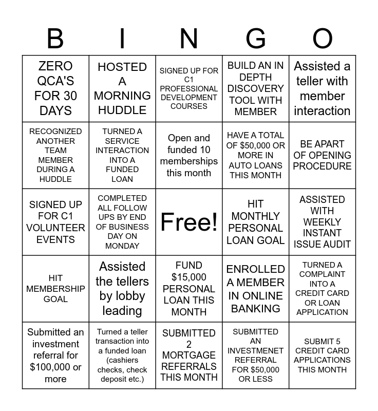 This bingo card has a free space and 24 words: Assisted the tellers by lobby leading, Turned a teller transaction into a funded loan (cashiers checks, check deposit etc.), Open and funded 10 memberships this month, Submitted an investment referral for $100,000 or more, Assisted a teller with member interaction, ZERO QCA'S FOR 30 DAYS, RECOGNIZED ANOTHER TEAM MEMBER DURING A HUDDLE, HOSTED A MORNING HUDDLE, HIT MONTHLY PERSONAL LOAN GOAL, FUND $15,000 PERSONAL LOAN THIS MONTH, HAVE A TOTAL OF $50,000 OR MORE IN AUTO LOANS THIS MONTH, SIGNED UP FOR C1 VOLUNTEER EVENTS, ENROLLED A MEMBER IN ONLINE BANKING, TURNED A COMPLAINT INTO A CREDIT CARD OR LOAN APPLICATION, TURNED A SERVICE INTERACTION INTO A FUNDED LOAN, SUBMITTED AN INVESTMENET REFERRAL FOR $50,000 OR LESS, ASSISTED WITH WEEKLY INSTANT ISSUE AUDIT, SIGNED UP FOR C1 PROFESSIONAL DEVELOPMENT COURSES, BE APART OF OPENING PROCEDURE, COMPLETED ALL FOLLOW UPS BY END OF BUSINESS DAY ON MONDAY, SUBMIT 5 CREDIT CARD APPLICATIONS THIS MONTH, HIT MEMBERSHIP GOAL, BUILD AN IN DEPTH DISCOVERY TOOL WITH MEMBER and SUBMITTED 2 MORTGAGE REFERRALS THIS MONTH.