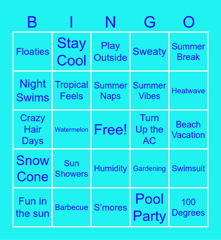 This bingo card has a free space and 24 words: Sun Showers, Barbecue, Summer Naps, Fun in the sun, Summer Break, Floaties, Night Swims, Stay Cool, Turn Up the AC, Humidity, Summer Vibes, Crazy Hair Days, Gardening, Swimsuit, Tropical Feels, Pool Party, Beach Vacation, Play Outside, Heatwave, Watermelon, 100 Degrees, Snow Cone, Sweaty and S’mores.